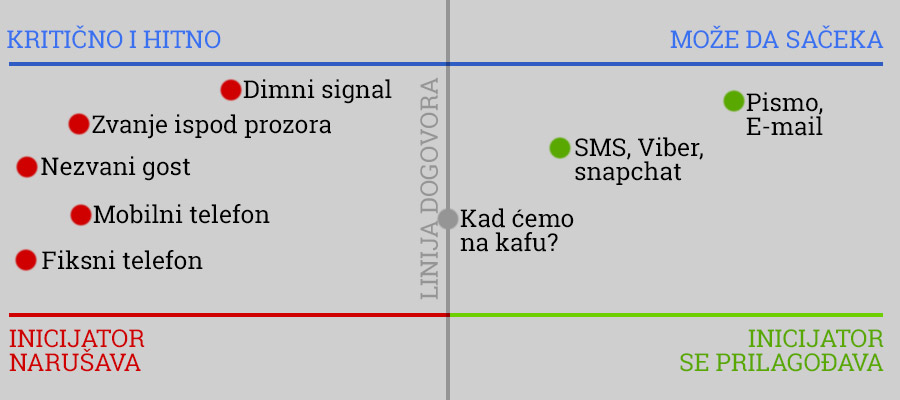 Apsolutno je prihvatljiva norma da se grupni Skajp pozivi ugovaraju mejlom ili porukama. Ljudi imaju vrijeme u kojima im je komforno da pričaju, imaju obaveze, nije svako dostupan odmah, niti se svakome odmah priča. Nekom magijom, kad se broj članova te grupe spusti na dva – sva ta opažanja nestaju. Trenutak u kome zoveš nekoga telefonom je trenutak u kome mu kažeš “ostavi sve što radiš i slušaj mene”. Nemam ništa protiv tvoje procjene, ali bi ti bolje bilo da je to što imaš da kažeš važnije od ovoga što si prekinuo, ili da ti makar nešto treba, jer je u suprotnom pritisak na crvenu slušalicu startni signal da ti se sočno najebem majke.